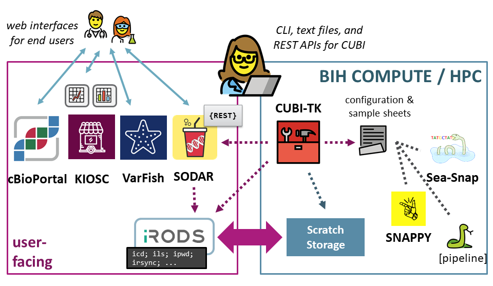 Generally, data is processed on the BIH High Performance Compute system. CUBI Toolkit facilitates the staging of meta data in the form of sample sheets and mass data files in the structure appropriate for the pipelines used by CUBI. Further, it makes running the pipelines easy and helps the user checking for the current pipeline running state.